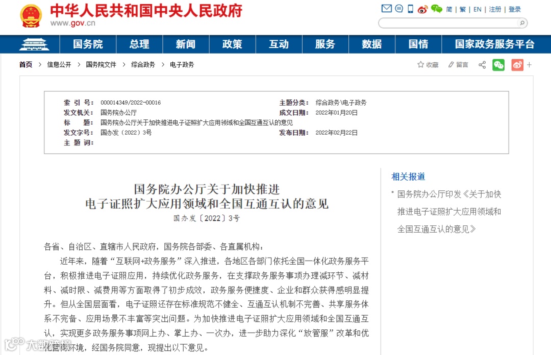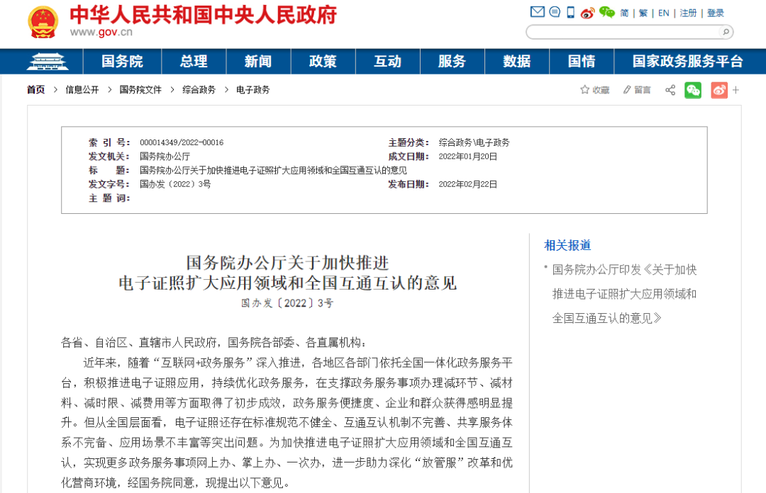 其实,早在2月22日,国务院办公厅发布《关于加快推进电子证照扩大应用领域和全国互通互认的意见》,明确加快推进电子证照扩大应用领域和全国互通互认,实现更多政务服务事项网上办、掌上办、一次办。