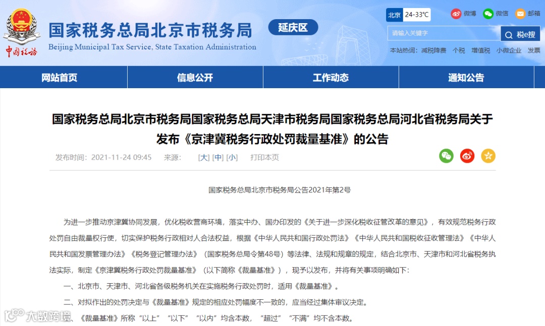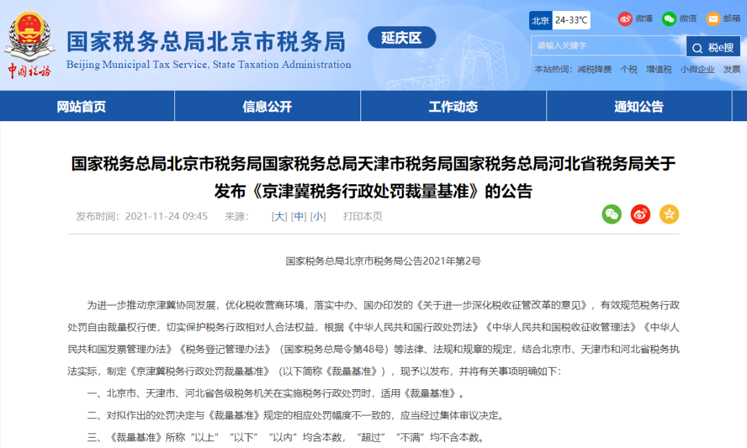 近期,北京市、天津市、河北省税务局联合发布《京津冀税务行政处罚裁量基准》公告: