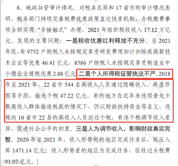 6月21日,审计署审计长侯凯向十三届全国人大常委会第三十五次会议作了《国务院关于2021年度中央预算执行和其他财政收支的审计工作报告》明确指出:个人所得税征管执法不严问题,涉及20余省,偷逃个税47.22亿元。