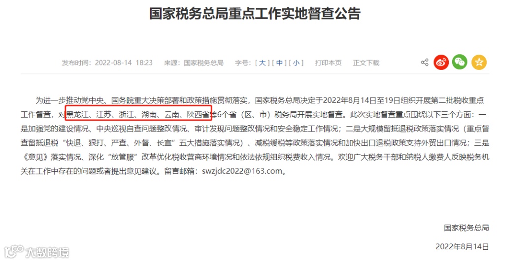 国家税务总局督查公告,涉及江苏、浙江、湖南、黑龙江、黑龙江、云南、陕西......更重磅的是,金税四期+智慧稽查+大数据,2022年最严稽查来了!