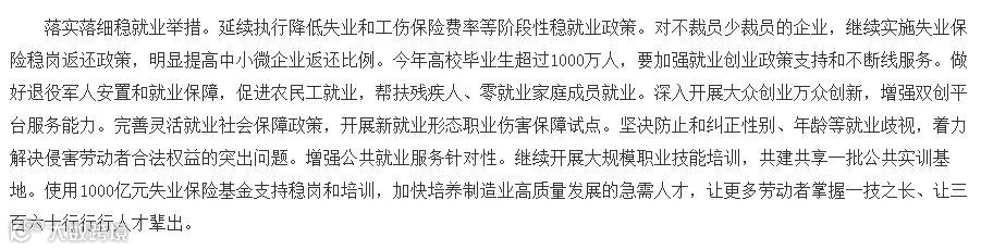 这次政府工作汇报中还提到:延续执行降低失业和工伤保险费率等阶段性稳就业政策。对不裁员少裁员的企业,继续实施失业保险稳岗返还政策,明显提高中小微企业返还比例。