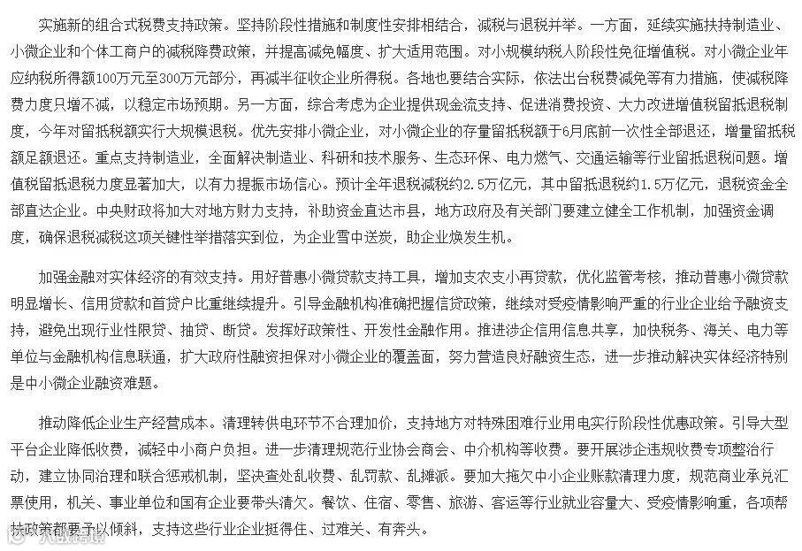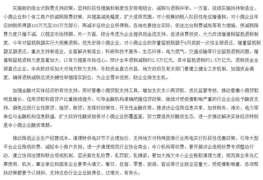 刚刚,国务院总理李克强作《政府工作报告》明确:实施新的组合式税费减免政策。延续实施扶持制造业、小微企业和个体工商户的减税降费政策,并提高减免幅度、扩大适用范围。对小规模纳税人阶段性免征增值税。对小微企业年应纳税所得额100万元至300万元部分,再减半征收企业所得税。各地也要结合实际,依法出台税费减免等有力措施,使减税降费力度只增不减,以稳定市场预期。