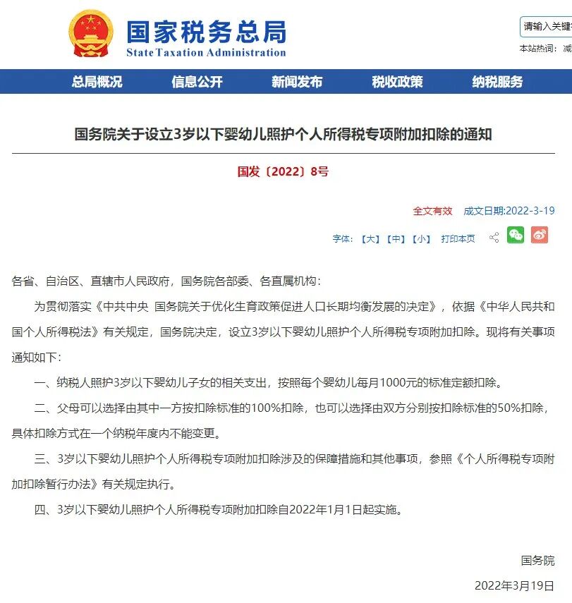 该项政策规定,自2022年1月1日起,纳税人照护3岁以下婴幼儿子女的相关支出,在计算缴纳个人所得税前按照每名婴幼儿每月1000元的标准定额扣除。具体扣除方式上,可选择由夫妻一方按扣除标准的100%扣除,也可选择由夫妻双方分别按扣除标准的50%扣除。监护人不是父母的,也可以按上述政策规定扣除。