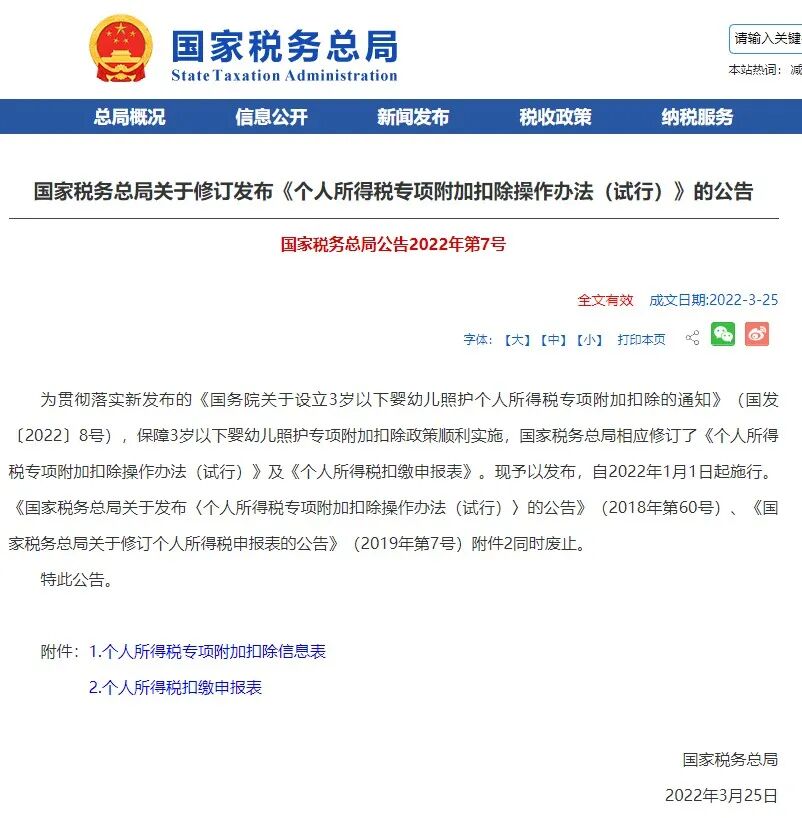 《通知》明确该项政策自2022年1月1日起实施。按照个人所得税法相关规定,专项附加扣除可以在申报当月扣除,也可以在以后月份发工资时补充扣除;平时发工资没有扣除的,或者没有任职受雇单位的,也可以在次年办理汇算清缴时补充扣除。例如,纳税人的子女在2021年10月出生,自2022年1月1日起纳税人即符合专项附加扣除享受条件。纳税人4月份将婴幼儿信息提供给任职受雇单位,单位在发放4月份工资时即可为纳税人申报1至4月份累计4000元的专项附加扣除。