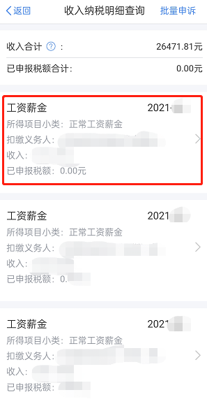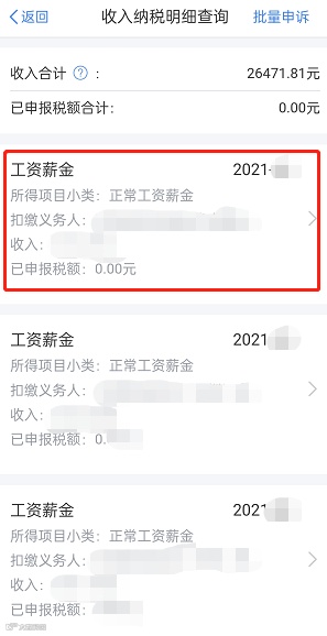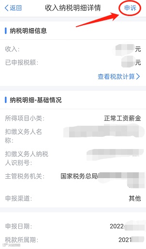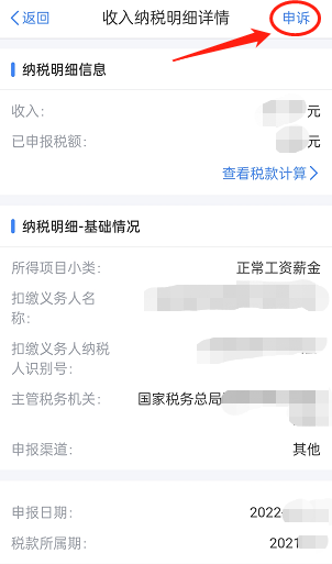 每一条收入纳税明细都可以点击查看详细信息,如果有异议,可以点击右上角的【申诉】。