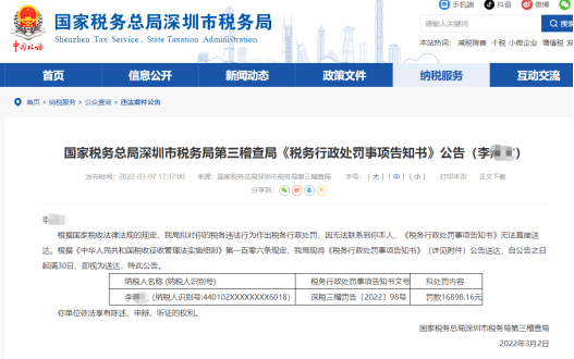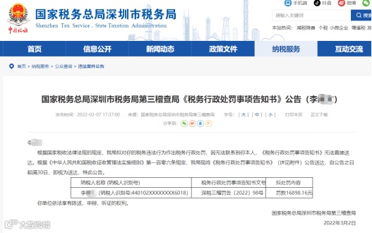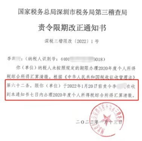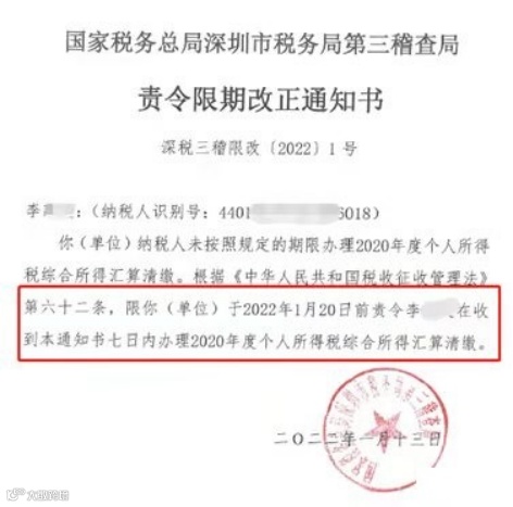 近日,深圳市税务局发布通告:李某某因未完成年度汇算清缴被定性为偷税!补税3万多!罚款50%!