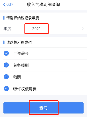 系统自动选择“2021”年度,可以查看2021年度的“工资薪金”、“劳务报酬”、“稿酬”、“特许权使用费”四项综合所得。