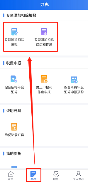 如果之前忘记填报或者相对已填报信息进行修改,点击【办税】,在【专项附加扣除填报】模块,可以进行填报或者修改、作废。