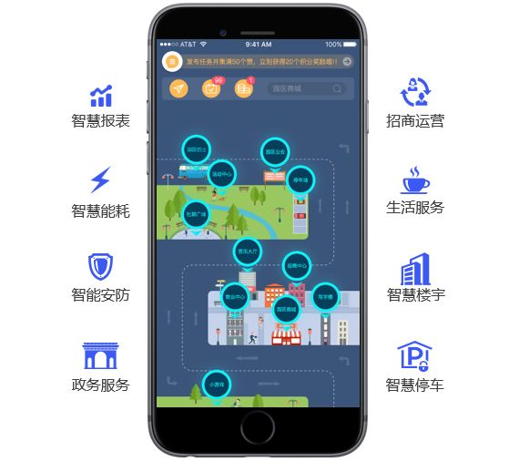 通过物联网技术手段,将园区设施与平台连接 ,实现智能出行、智能安防、智能物业,减少人力投入,节约人力成本,提高管理效率,同时,为园区客户带来超预期的服务体验。