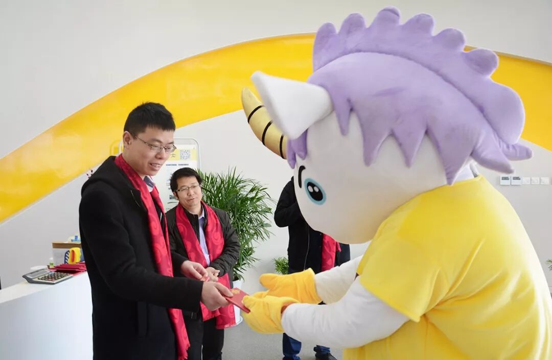 Yeahmobi先锋队员:陈文凯、孙凤正、秦鹏,他们身戴正红福运围巾,为这一天前100名到岗的Yeahmobier送上“金犬旺福金币”和“新春开工祝福”。