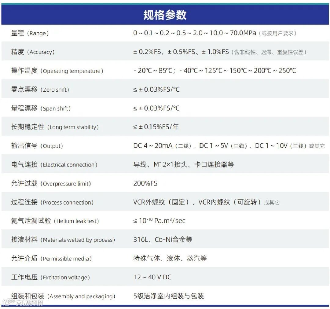 ▲ 特殊的钢基薄膜技术,量程范围宽(0 ~ 0.1 ~ 0.2 ~ 0.5 ~ 2 ~ 5 ~ 10 ~ 70 MPa)。