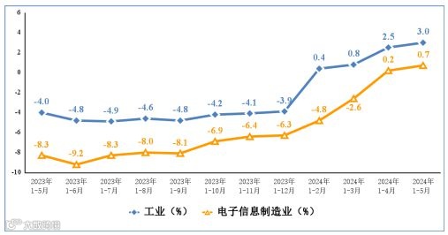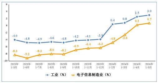 近日,工信部网站日前发布2024年1-5月电子信息制造业运行情况。数据显示,1-5月份,我国电子信息制造业生产稳步增长,出口稳定恢复,效益逐月改善,投资增速加快,行业整体增势明显。