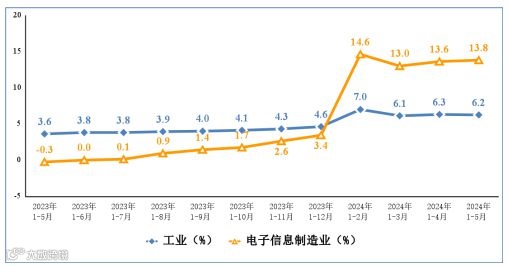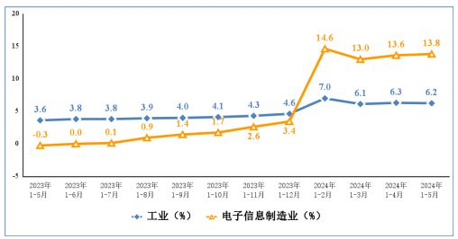 1-5月,规模以上电子信息制造业增加值同比增长13.8%,增速分别比同期工业、高技术制造业高7.6个和5.1个百分点。5月份,规模以上电子信息制造业增加值同比增长14.5%。