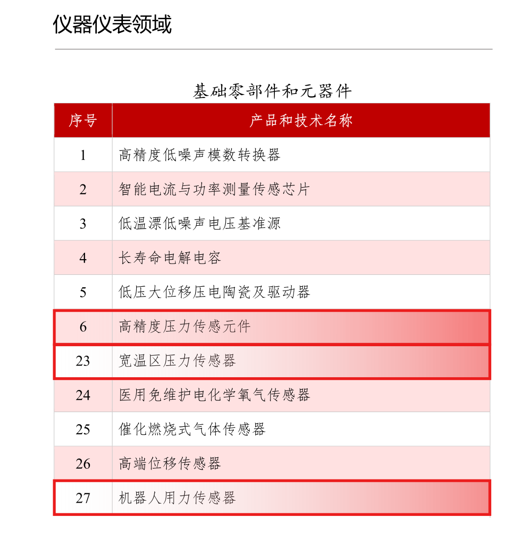 高精尖技术讨不来,也买不到,自主研发制造是破局唯一的出路。在传感器领域,我国的首要目标仍是实现核心元器件的国产化。2022 年国家产业基础专家委员会编制的《产业基础创新发展目录》(产业“五基”)就将高精度压力传感元件、宽温区压力传感器、机器人用力传感器等零部件和元器件列为我国急需突破的主要产品和技术。