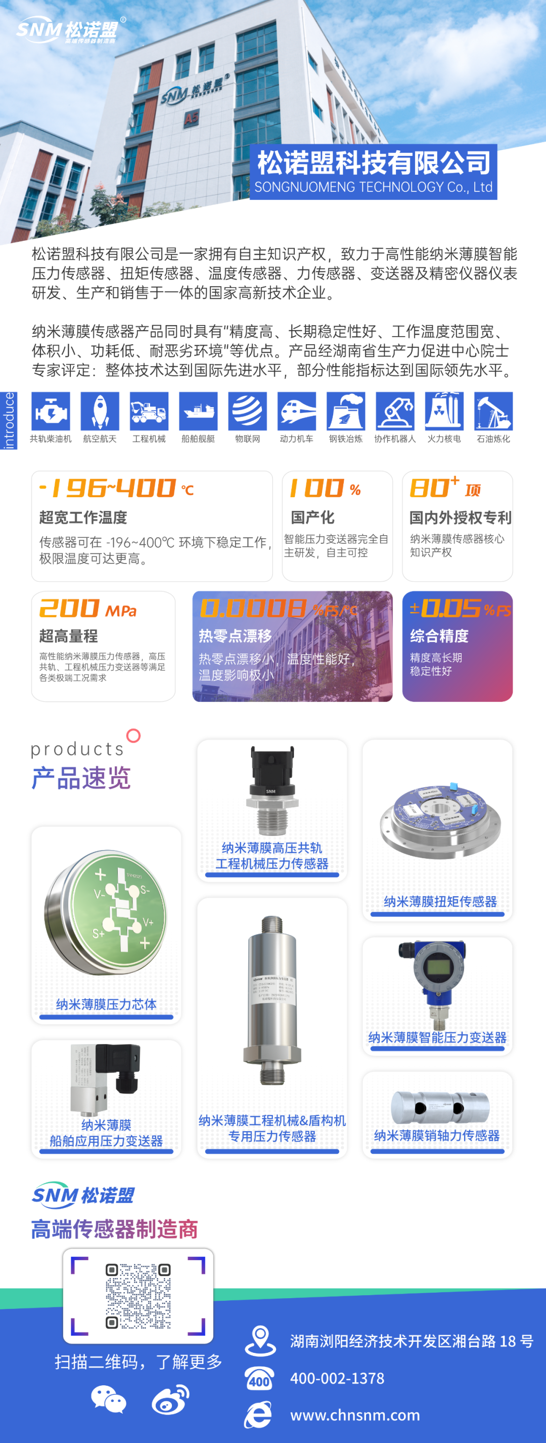 松诺盟科技有限公司是一家拥有多项传感器核心技术,致力于研发、生产与销售国产高性能纳米薄膜传感器的国家高新技术企业。