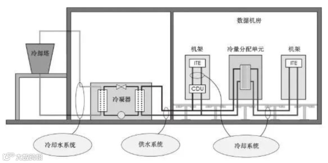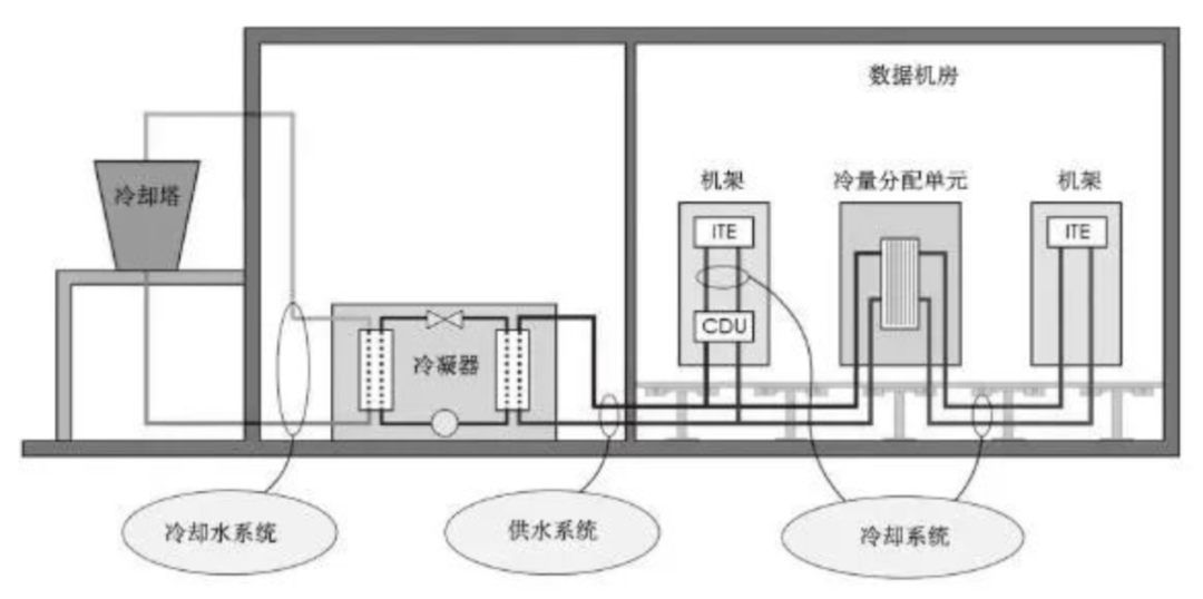 服务器设备区:放置服务器的区域,设备产生的热量通过液冷系统进行散热。