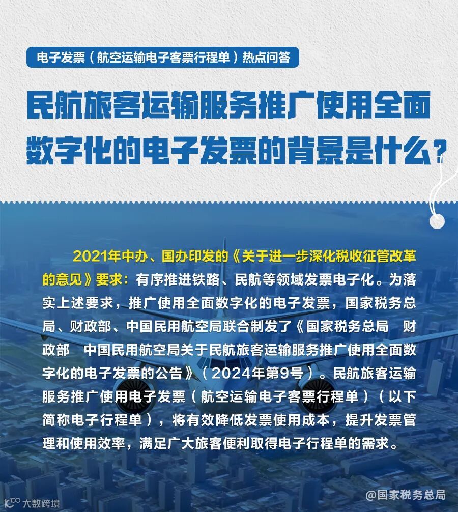 日前,国家税务总局 财政部 中国民用航空局联合发布《关于民航旅客运输服务推广使用全面数字化的电子发票的公告》,明确自2024年12月1日起,在我国民航旅客运输服务领域推广使用全面数字化的电子发票——电子发票(航空运输电子客票行程单)。相关热点问答如下↓