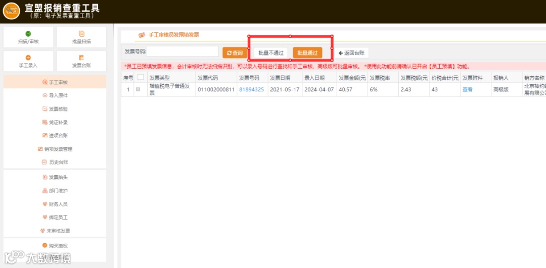 新增了会计批量审核功能!员工上传发票后,高级版用户可在小程序或电脑端【手工审核】界面看见全部待审核数据,可批量选择进行审核!