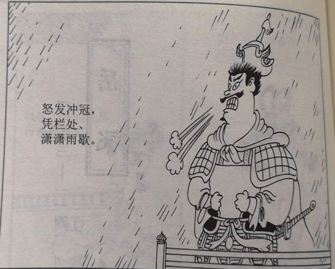 在《漫画宋词》里,岳飞怒发冲冠的画面描绘得相当精彩,凸出的双目、嘶吼着的大嘴巴、直立的头发,被顶飞的帽子、紧握的双拳……将岳飞那时悲愤交加形象刻画得淋漓尽致。