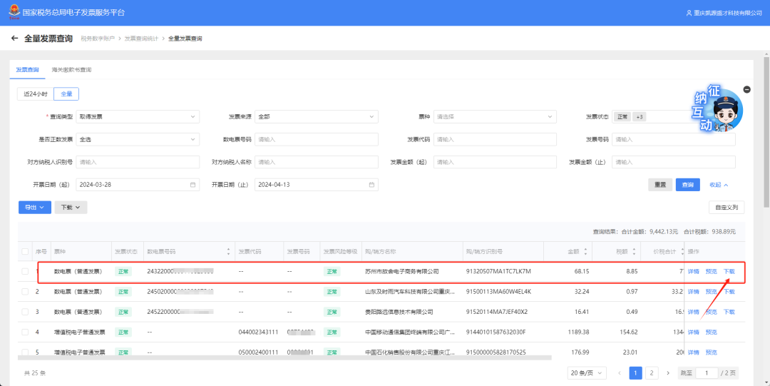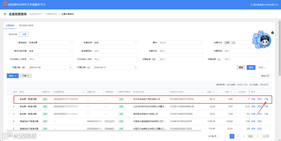 如果税局等相关部门或者单位要求员工报销数电发票时必须提供XML文件,但是开票方又没有提供对应的XML文件,其实除了去找对方相关部门索要外,自家单位的财务也可以通过登录单位电子税务局账号,在数字税务账户中找到全量发票查询,根据发票号码快速找到该数电票的记录,点击下载按钮就可以下载到该数电票的版式文件。