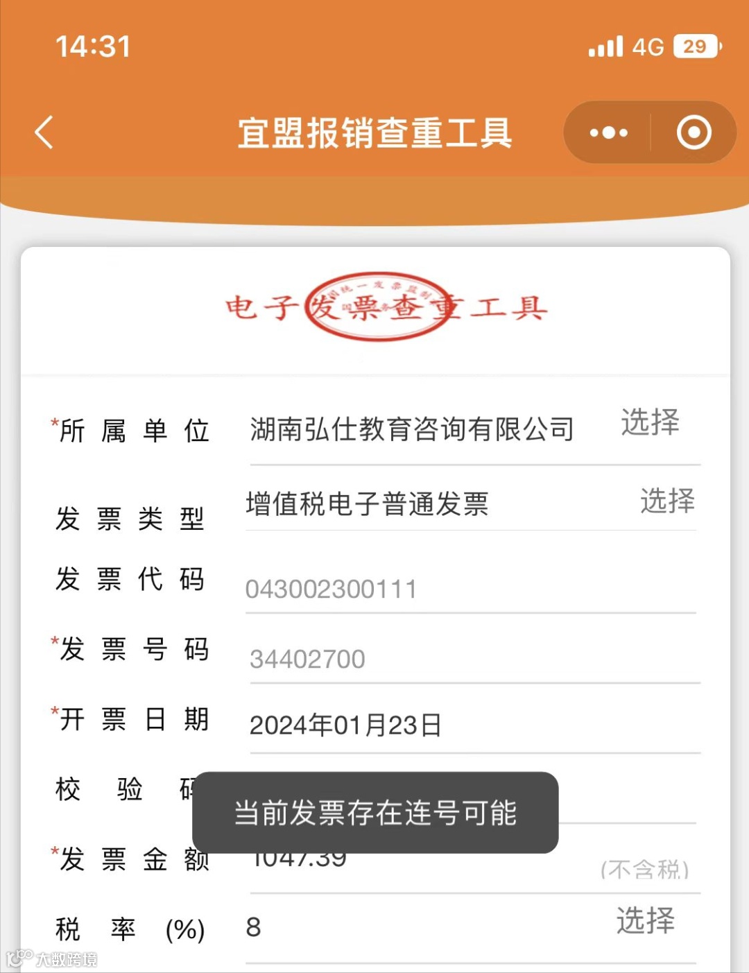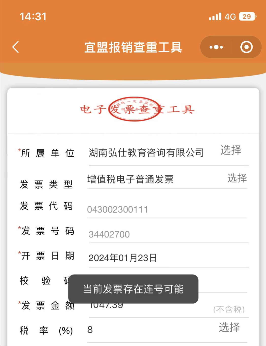 传统纸电发票需要先去税局领取一个号码段的空白发票(且有规定每张发票可开最大金额,比如万元版、千元版等),然后逐张开具,所以就存在连号的可能。当然,连号可能是由于正常支付的金额超过发票的最大金额,所以需要连续开具;同时也有可能是其他非正常开票出现的连号情况,这种就会存在税务风险。宜盟报销查重工具可以自动识别并提醒连号。
