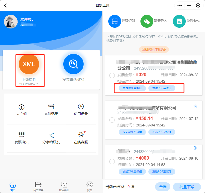 验票工具是专本针对报销人员使用的一款数电发票XML原件下载及电子发票真伪查验的的工具,报销人员可以通过上传数电发票的PDF或者直接扫描数电发票PDF上的二维码进行数电发票XML文件的下载,下载成功后可以一键转发给微信好友或者微信文件助手,从而满足企业财务关于数电发票报销上传XML原件的的要求。