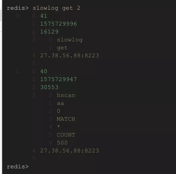 使用slowlog get 2命令查看最近的两条慢日志信息,如上图,我们可以看到每条日志中包含的信息有六个部分组成,从上到下编号为 0-5,依次代表的意思是