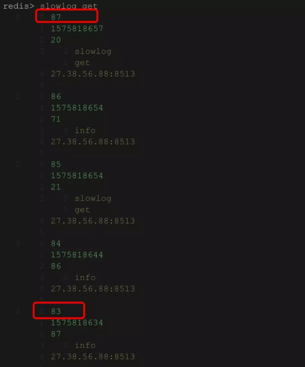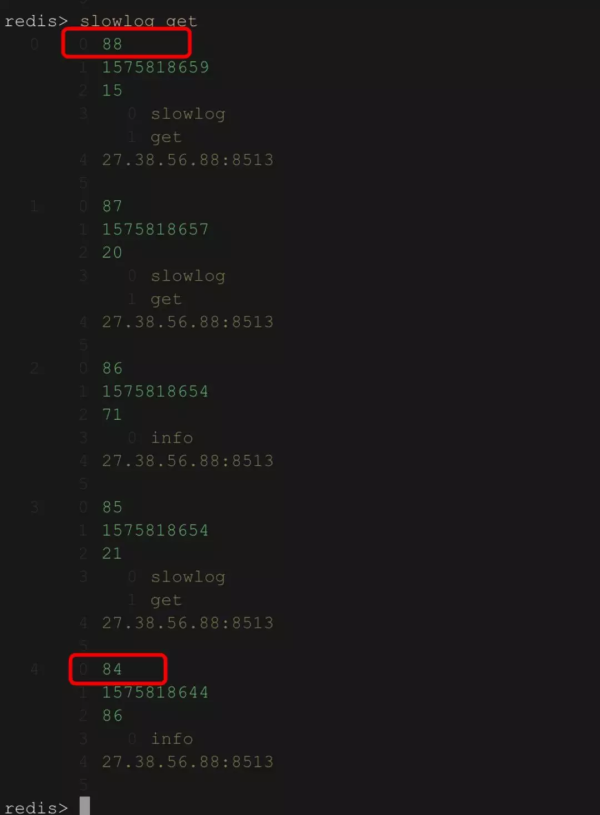 再次使用slowlog get命令查询的编号结果是84-88,说明 ID 为 83 的那一条已经被删除了。