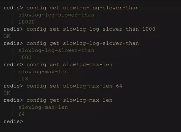 上面我们使用config get 命令查看了时长设置和条数设置,相反的我们可以用config set来设置相关参数,如下图,我们先查看一下配置,然后再通过config set slowlog-log-slower-than 1000 命令和 config set slowlog-max-len 64 命令来设置具体的值: