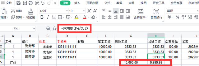 采用Excel的汇总公式,算出来的汇总金额,绩效工资列的总额将会为10000,但是可能实际发送时,这一项实际发送的金额将会时9999.99。这也就是一分钱的问题来源。