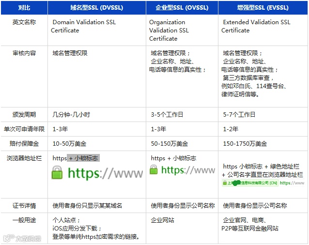 下面,就以一张图给大家详细介绍这三种SSL证书的区别,大家一目了然,这样够简单易懂。