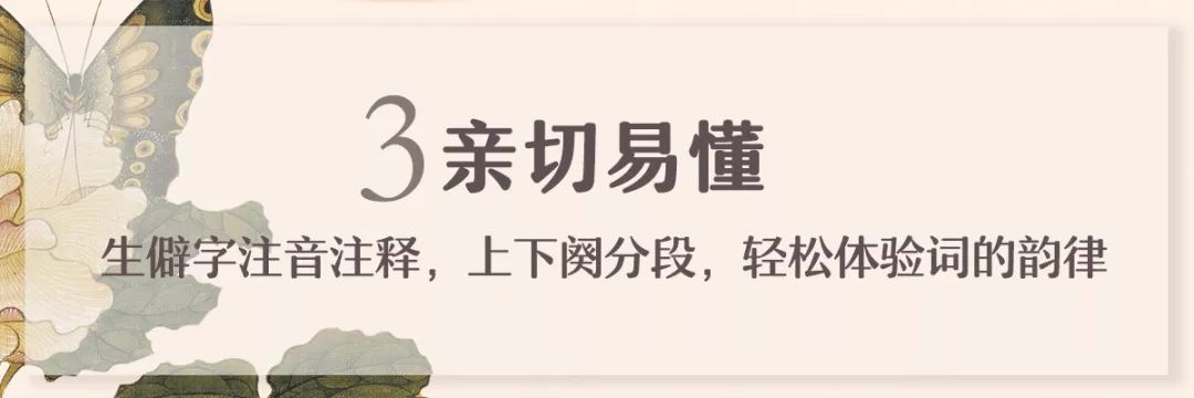 这次我们对内文采用上下阕分段、词牌间不联排,以工整雅致、生僻字注音的方式最大限度降低你诵读的难度。