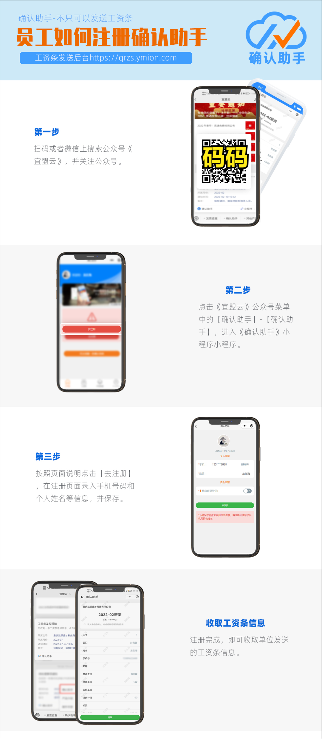 因为确认助手是通过你的手机号码进行身份绑定的,如果你自己注册时填写的手机号码与单位工资表中的号码不一致,也是无法收到工资条信息的。这种情况下,你可以修改你自己的手机号码或者重新给单位提供你自己绑定的号码,之后发送的工资条即可正常收到。