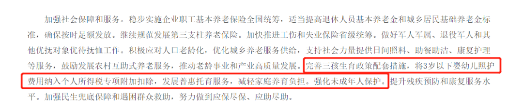 宜盟云2022年3月5日上午9点,中华人民共和国第十三届全国全国人民代表大会第五次会议在北京人民大会堂开幕,国务院总理李克强作政府工作报告,其中提到了完善三孩生育政策配套措施,将3岁以下婴幼儿照护费用纳入个人所得税专项附加扣除,发展普惠托育服务,减轻家庭养育负担。