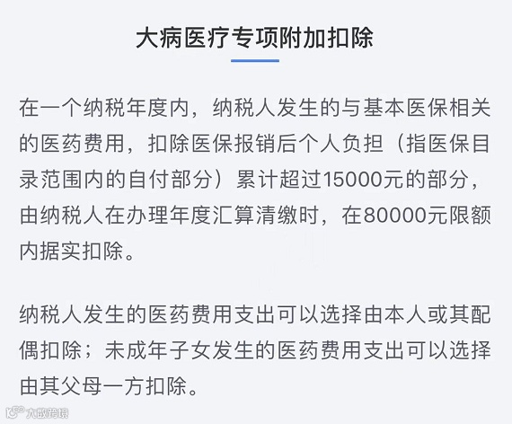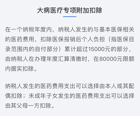 答:对大病医疗扣除设定扣除金额上限,采取限额内据实扣除方式。在次年3月1日至6月30日汇算清缴时扣除。