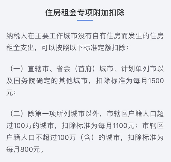 答:(一)直辖市、省会城市、计划单列市以及国务院确定的其他城市,扣除标准为每月1500元;