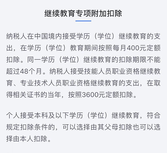 答:纳税人在中国境内接受学历(学位)继续教育的支出,在学历(学位)教育期间按照每月400元定额扣除。同一学历继续教育的扣除期限不能超过48个月。纳税人接受技能人员职业资格继续教育、专业技术人员职业资格继续教育支出,在取得相关证书的当年,按照3600元定额扣除。