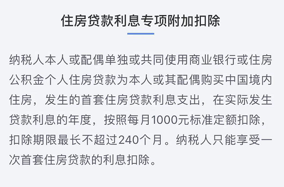 答:在实际发生贷款利息的年度,按照每月1000元标准定额扣除,扣除期限最长不超过240个月。纳税人只能享受一次首套住房贷款的利息扣除。
