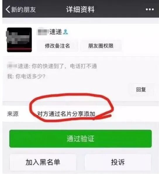 2、快递小哥加微信:自称你的快递包裹到了,但电话打不通,无法联系送快递。