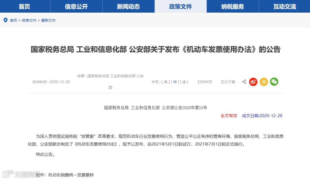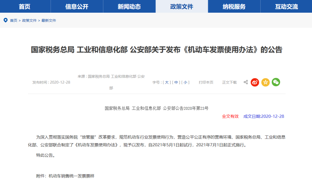 《机动车发票使用办法》自2021年5月1日起试行,2021年7月1日起正式施行。