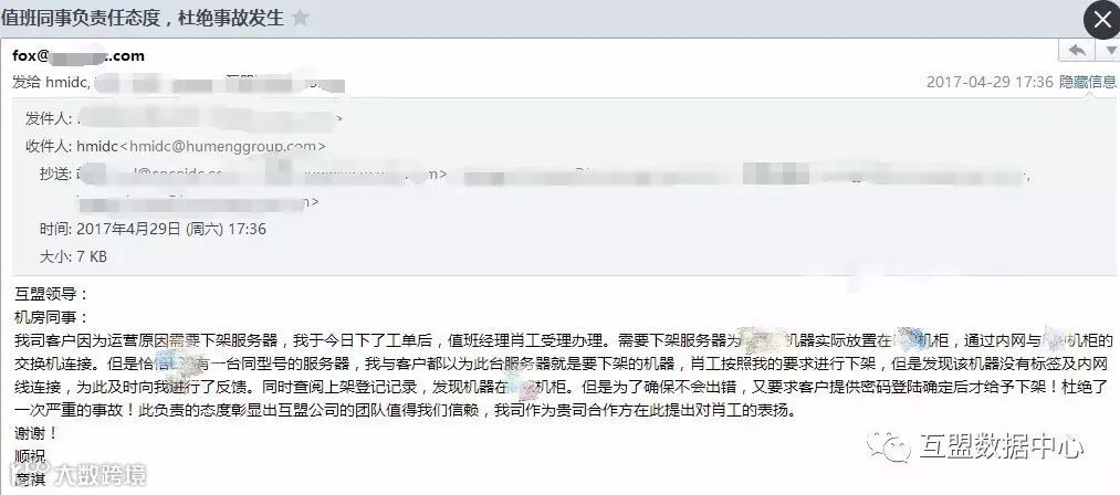 我司客户因为运营原因需要下架服务器,我于今日下了工单后,值班经理肖工受理办理。需要下架服务器为###机器实际放置在###机柜,通过内网与###机柜的交换机连接。但是恰恰###有一台同型号的服务器,我与客户都以为此台服务器就是要下架的机器,肖工按照我的要求进行下架,但是发现该机器没有标签及内网线连接,为此及时向我进行了反馈。同时查阅上架登记记录,发现机器在###机柜。但是为了保证不会出错,又要求客户提供密码登陆确定后才给予下架!杜绝了一次严重的事故!此负责的态度彰显出互盟公司的团队值得我们信赖,我司作为贵公司合作方在此提出对肖工的表扬。