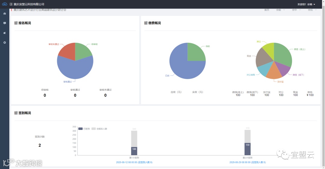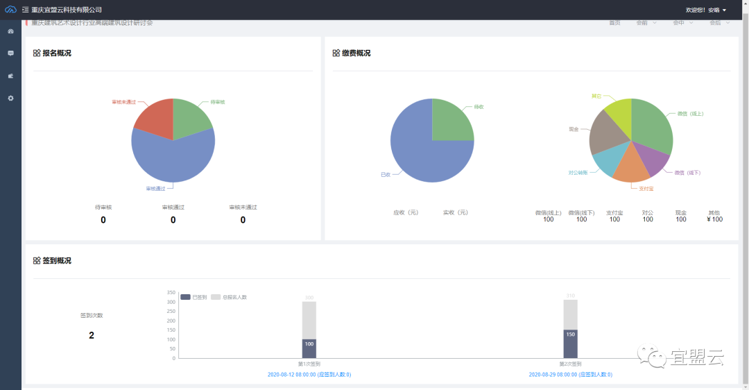 活动结束后可自动生成当场活动的数据表全面的进行数据分析,让您实时了解会议活动前的报名数据、短信通知数据,会议活动中的签到情况、缴费审核情况和会后的发票数据等总体数据信息。此外后续还支持对所有会议活动参与人的行为数据进行联通实现标签化管理,形成精准的用户画像。为后续会议活动实现分类发送短信通知邀请等,实现对企业的粘度。