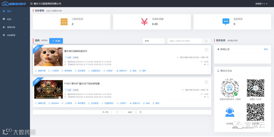 宜盟无需繁琐复杂的操作,只需要在手机或者电脑简单点点点10分钟即可轻松创建会议活动。轻松实现活动(会)前的全流程,全方位推广、活动中(会)中的放松项目,数据等实时把控、活动(会)后的各种数据汇总导出、分析。宜盟致力于让您创办的活动更加专业,更加有效率。