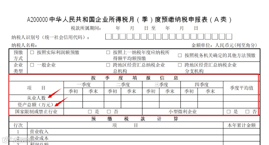 将《中华人民共和国企业所得税月(季)度预缴纳税申报表(A类)》(A200000)“按季度填报信息”部分前移,并扩充“从业人数”和“资产总额”栏次,列示第一季度至税款所属季度的各季度季初值、季末值、季度平均值,方便纳税人在申报时修正之前季度的错报数据。