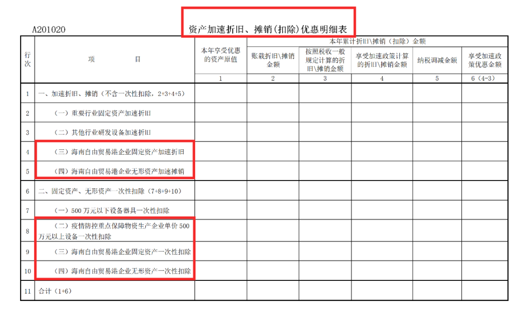 二是增加“海南自由贸易港企业固定资产加速折旧”“海南自由贸易港企业无形资产加速摊销”“海南自由贸易港企业固定资产一次性扣除”“海南自由贸易港企业无形资产一次性扣除”“疫情防控重点保障物资生产企业单价500万元以上设备一次性扣除”等行次,并明确相关行次的填报要求。