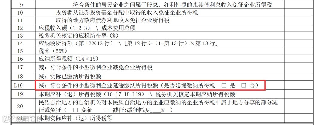 增加临时行次第L19行“减:符合条件的小型微利企业延缓缴纳所得税额(是否延缓缴纳所得税□是□否)”,并明确相关行次的填报要求。