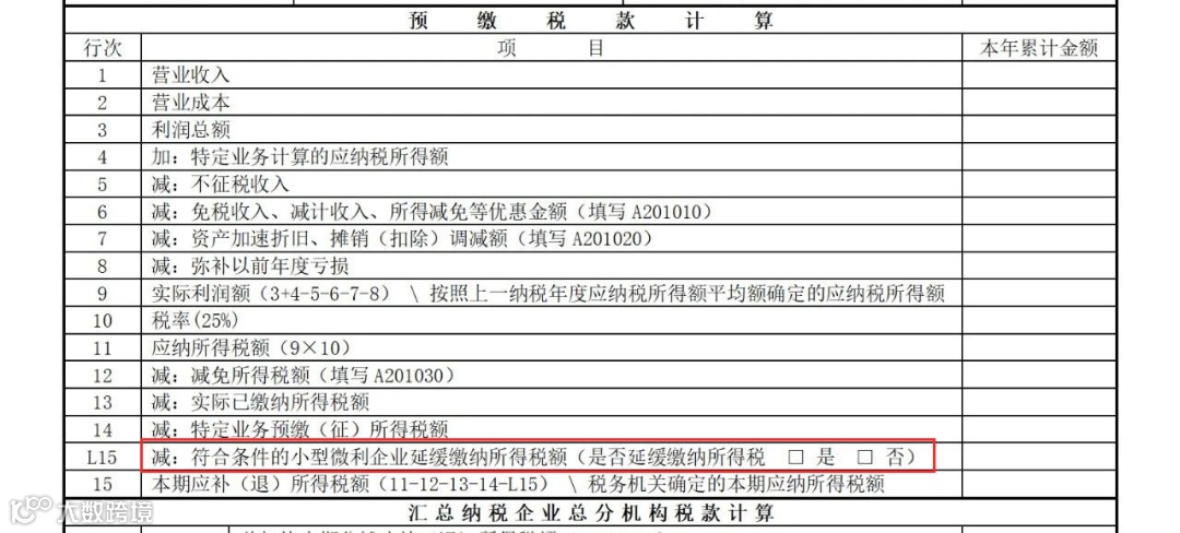 《中华人民共和国企业所得税月(季)度预缴纳税申报表(A类)》(A200000)增加临时行次第L15行“减:符合条件的小型微利企业延缓缴纳所得税额(是否延缓缴纳所得税□是□否)”,并明确相关行次的填报要求。