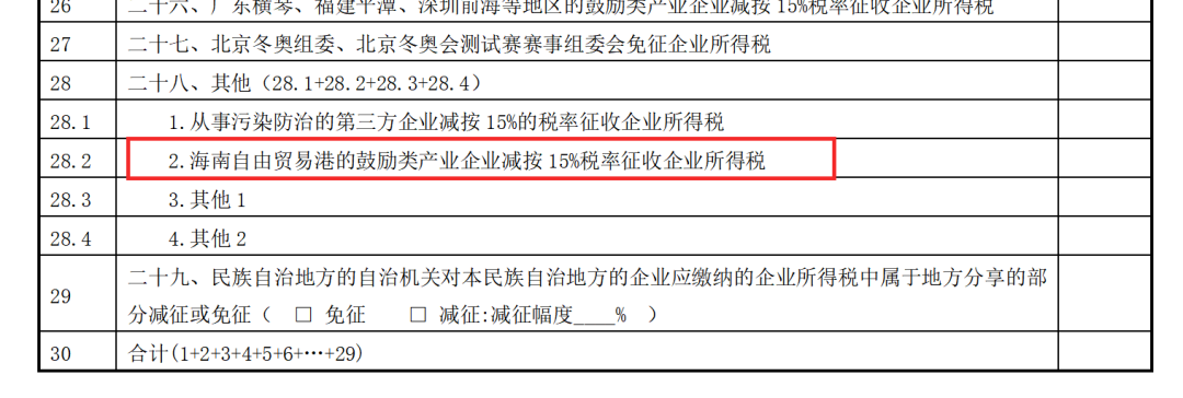 在《减免所得税优惠明细表》(A201030)第二十八项“其他”项目下增加了“海南自由贸易港的鼓励类产业企业减按15%税率征收企业所得税”行次,并明确相关行次的填报要求。