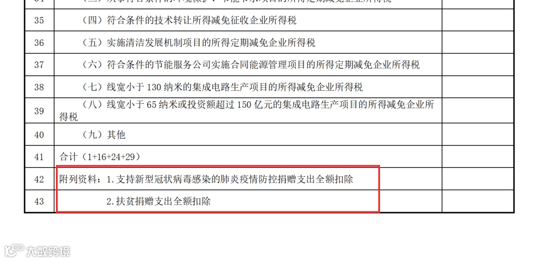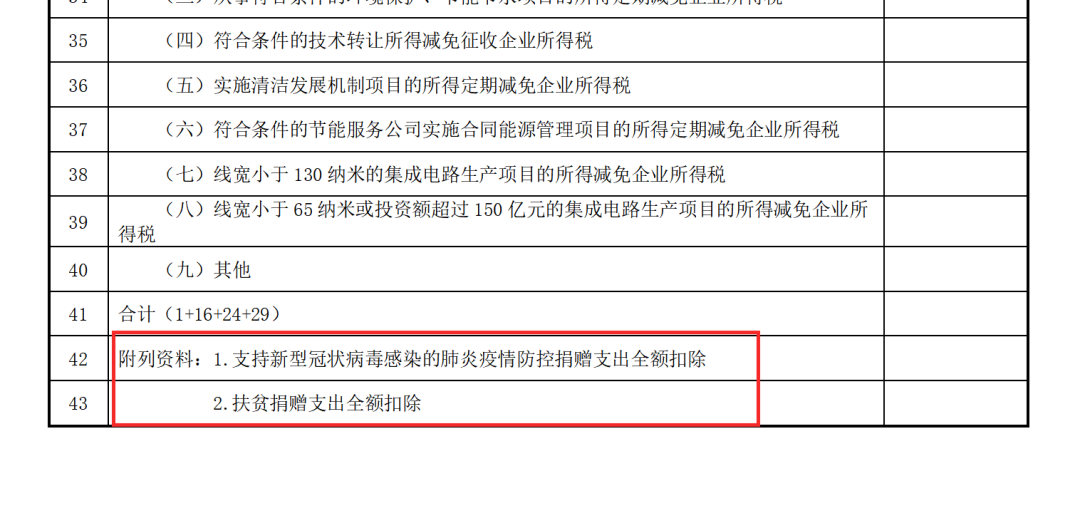 《免税收入、减计收入、所得减免等优惠明细表》(A201010)增加“支持新型冠状病毒感染的肺炎疫情防控捐赠支出全额扣除”和“扶贫捐赠支出全额扣除”行次,并明确相关行次的填报要求。