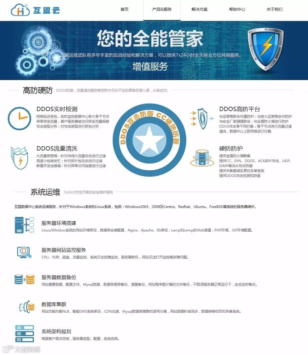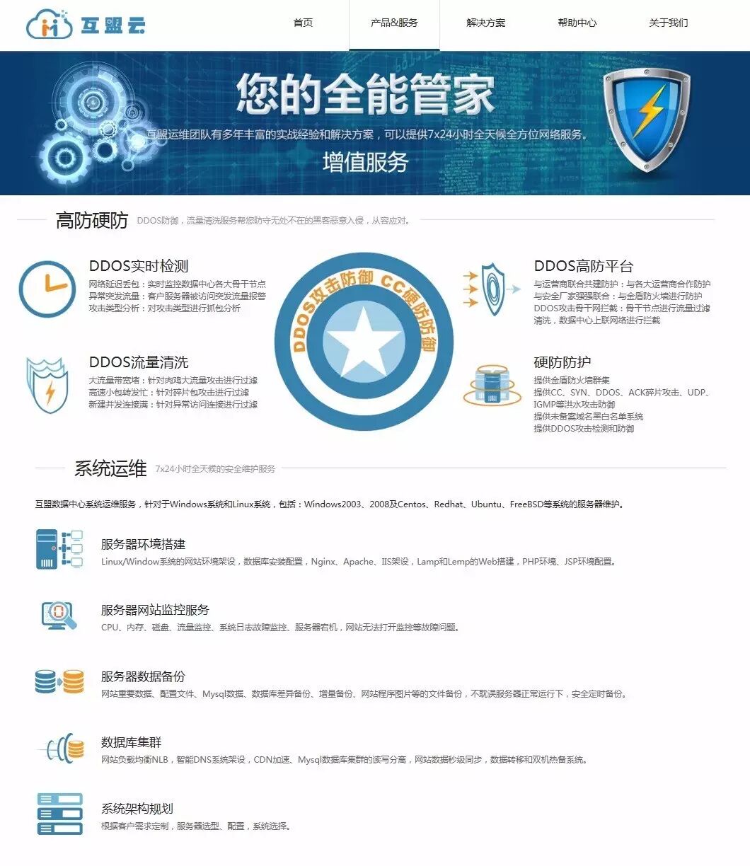 互盟的增值服务,看了更是赞到不行呢!高防硬防,DDOS防御,流量清洗服务帮您从容面对无处不在的黑客恶意入侵!除了防御之外,互盟也提供系统运维,互盟是一个有着多年丰富运维经验的团队,针对于Windows系统和Linux系统,包括:Windows2003、2008以及Centos、Redhat、Ubuntu、FreeBSD等系统的服务器维护。